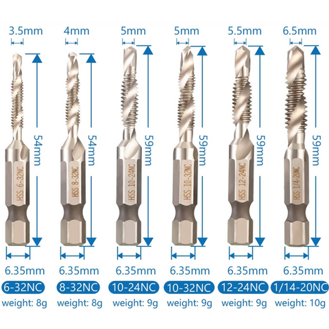 - Metric & SAE Drill Sizes - 6 tap drills in different sizes, such as M3 x 0.5, M4 x 0.7, M5 x 0.8, M6 x 1, M8 x 1.25, M10 x 1.5, standard 1/4 inch (6.35 mm) hex shank